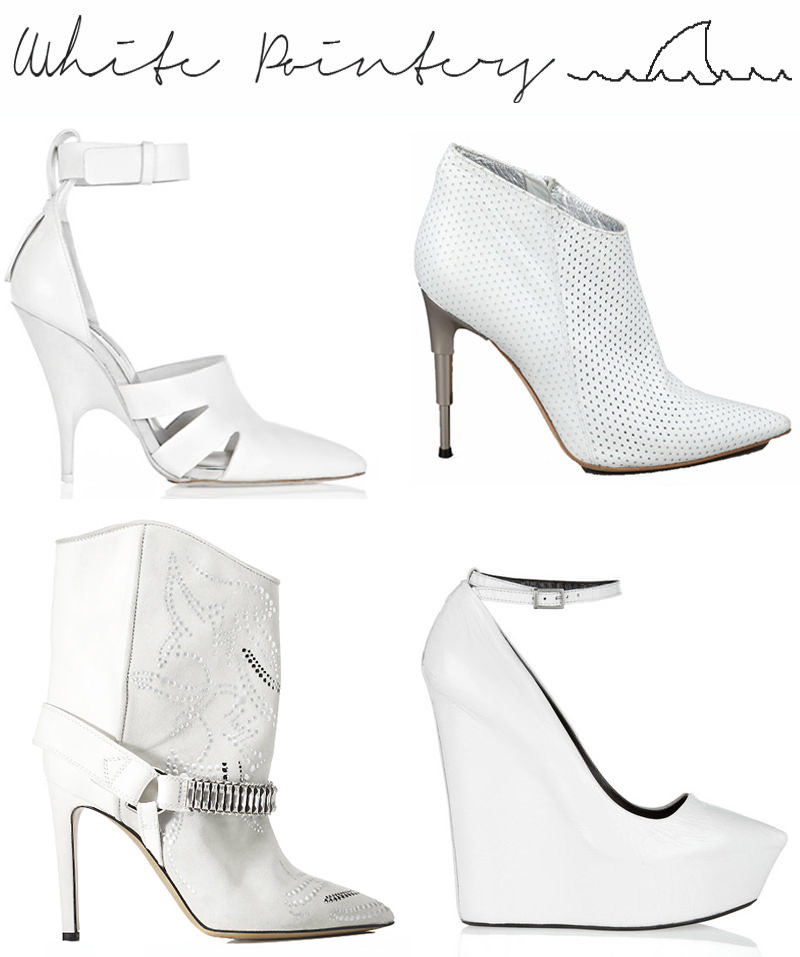 28. 03. 2012 White Pointers Shopping Totally feeling the vibe for crisp white pointed toe heels right now. Just a few of my favourites.. 1. Alexander Wang ‘Joan’..here 2. Thierry Mugler Perforated bootie..here 3. Isabel Marant ‘Milwauke’ ankle boot..here 4. Theyskens Theory Patent Leather heel..here Share this:Click to share on Twitter (Opens in new window)Click to share on Facebook (Opens in new window) 0 0 0 0 Related Posts Suns Out Tonic The Fundamentals Geometric Sunday Sanctuary: Union