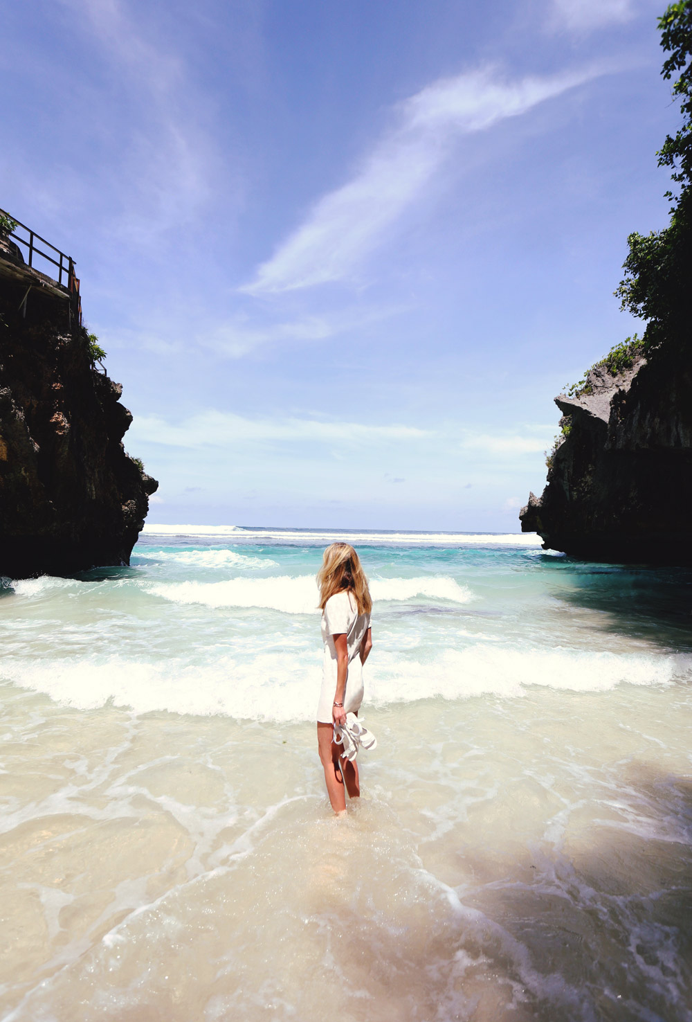 Among other things in your life it should be on the top of your list to visit this place. It’s not every day that you climb through a crevice in the earth to descend into a cave that opens up into this amazingness. Usually I’m hiking this little trek with a surfboard under my arm but since this is a fashion blog after all I thought it best to actually wear real clothes. I couldn’t think of a better choice than this favourite white leather number right now .. perfectly washed out ..